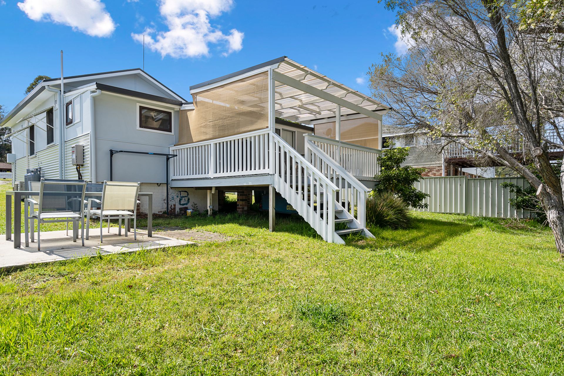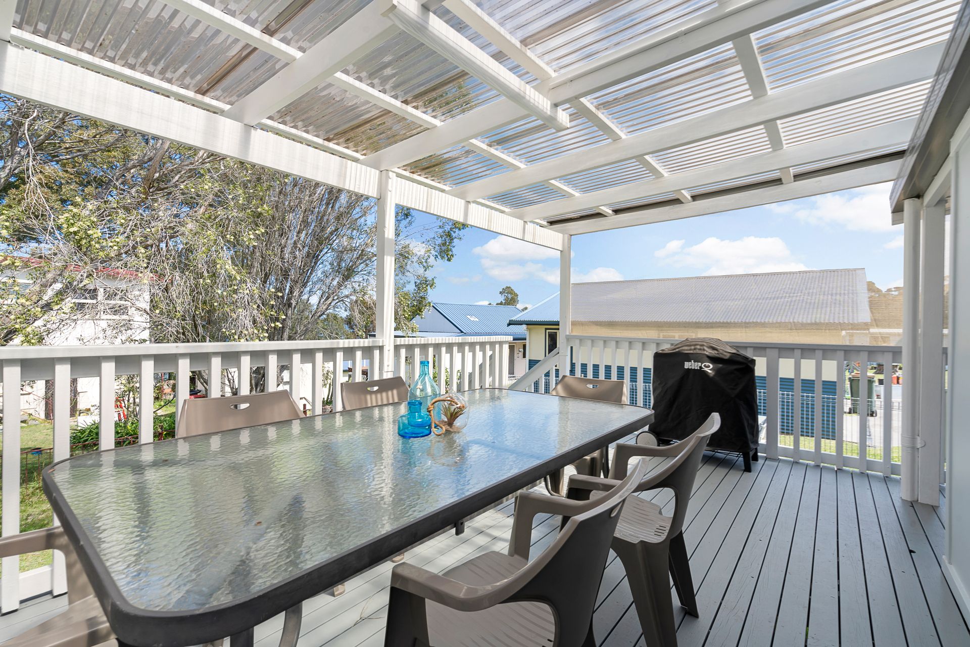 Outdoors: Huge grassed yard area and under cover outdoor setting and bbq with water glimpses.