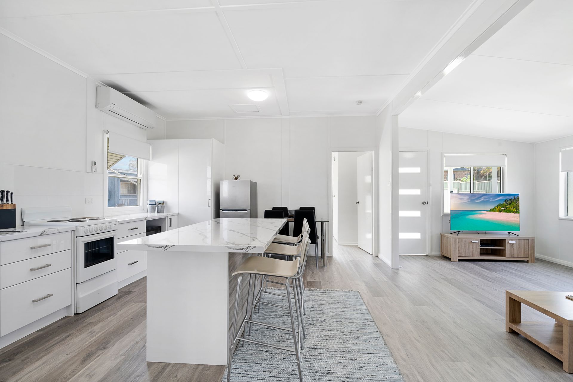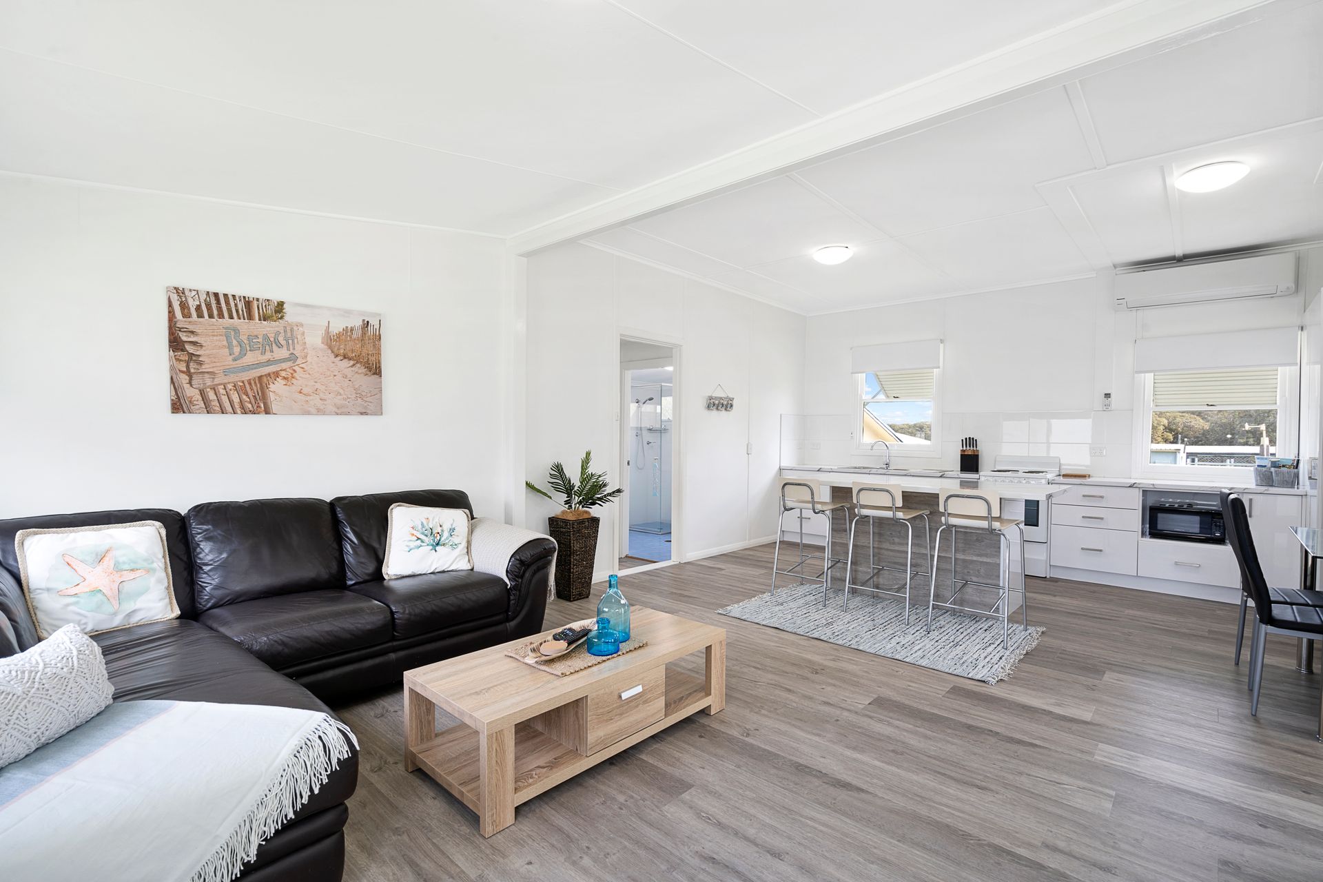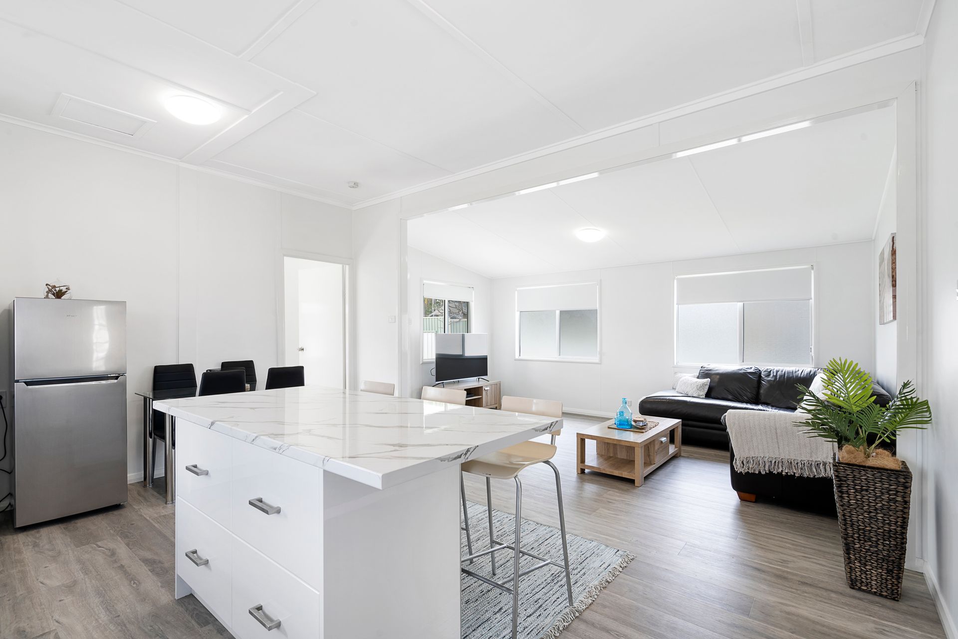A large entertainers kitchen opens to the dining and living room which has a comfortable leather lounge and flat screen TV.