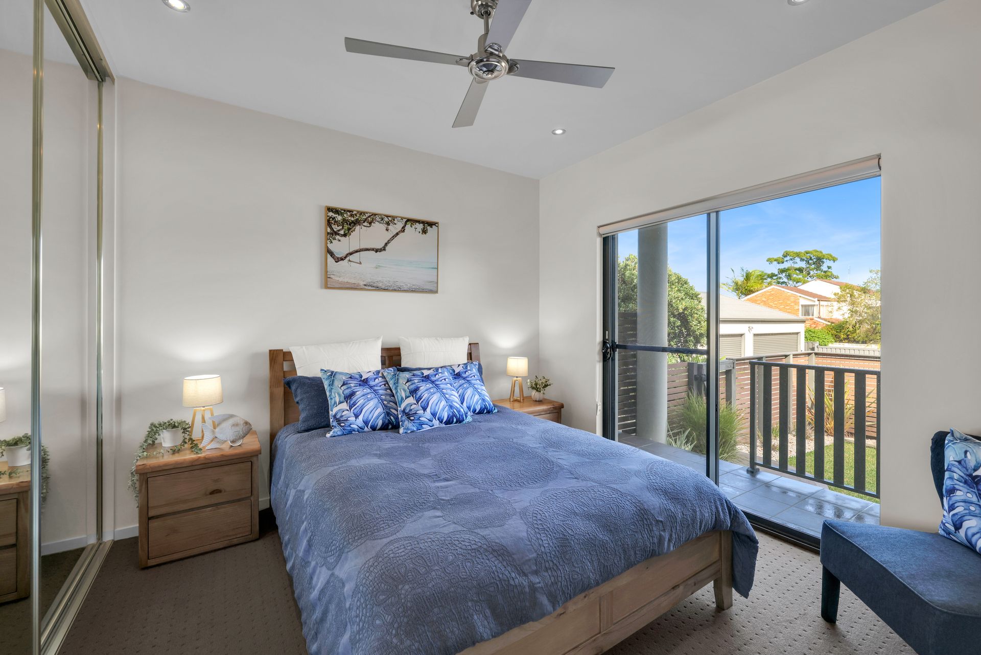 Bedroom 2 – Queen bed with built-in robe, ceiling fan and access to the back patio.