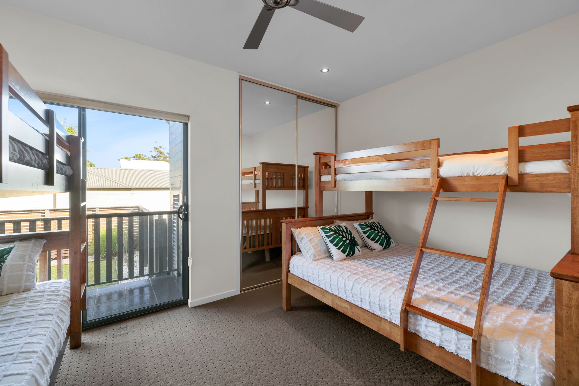 Bedroom 3 – One tri-bunk (double below, single on top) and a separate king single bunk, ceiling fan, robe, and patio access.